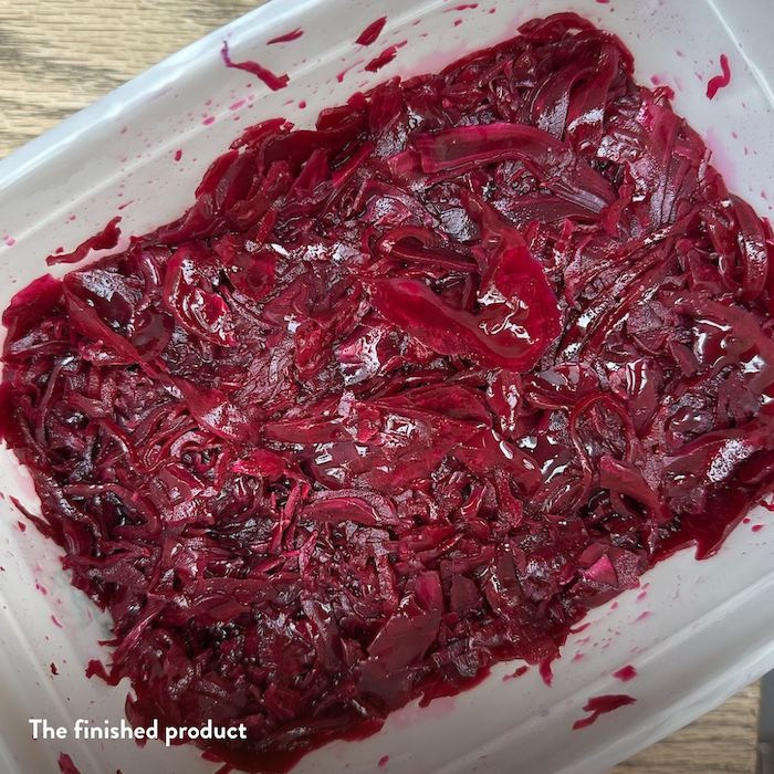- Colour. Once the colour has turned from the blueish-purple of the raw cabbage to a rich warm pink/red - this means it is no longer alkaline. You can test this by taking a spoon of the brine and put it onto a white plate, and adding a little washing up liquid to it. The liquid turns acid alkaline, so the rich pink brine will turn back to a bluish purple.